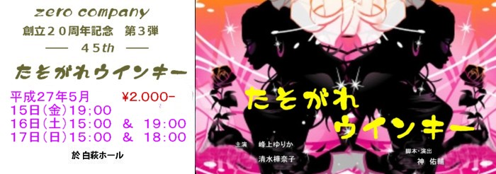 | 皆様のお陰をもちまして、ゼロ・カンパニーも創立20周年を迎えることができました。 そこで、年内は記念公演を催していくこととなりました。どうかお楽しみに。 |
